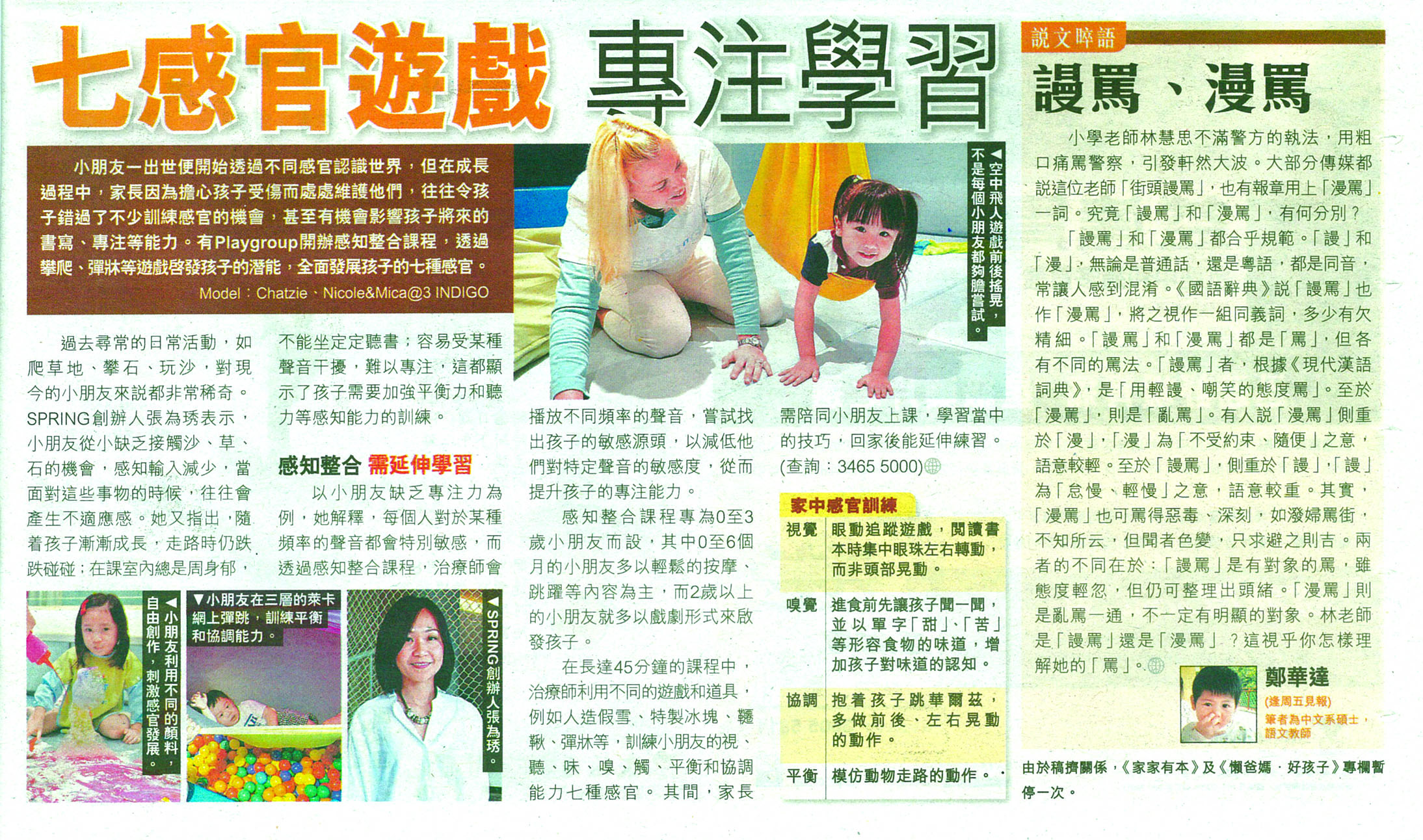 Posted on 23 August, 2013Metro reports on SPRING’s special sensory programmes and talks about why sensory integration is important for children (Chinese)